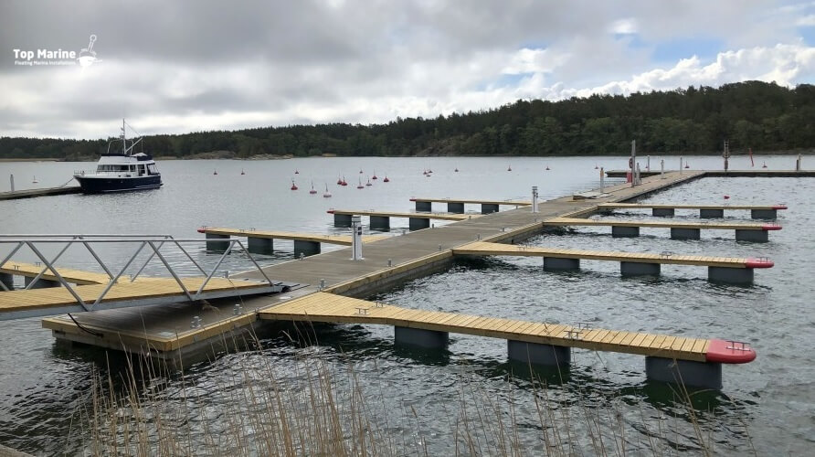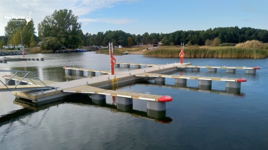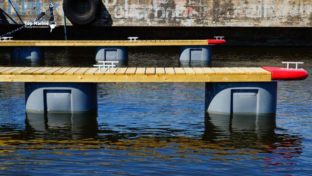 300-litrowe formowane rotacyjnie pływaki z tworzywa sztucznego wypełnione są EPS co gwarantuje dużą nośność odnogi cumowniczej. Stożkowy kształt pływaka zmniejsza ryzyko uszkodzenia przez lód w okresie zimowym. Elementy drewniane wykonane są z drewna sosnowego sortowanego pod względem wytrzymałości oraz łączonego na mikro wczepy, a przede wszystkim jest impregnowane ciśnieniowo. Specjalne ryflowanie poszycia pozwala zminimalizować ryzyko poślizgnięcia się. System mocowania odnogi cumowniczej zapewnia również cichą pracę w warunkach zafalowania.